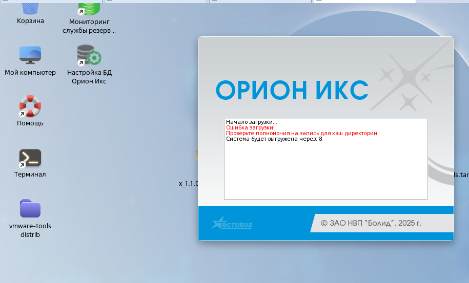 Здравствуйте. Сейчас работаю с Орион Х под ОС Астра Линукс. Поставил Orion X на виртуальную машину VMware на ОС Astrs Linux Special Edition версия 1.8.1.16, образ установочного диска installation-1.8.1.16-27.12.24_15.22.iso. Файл установки Орион Х - orion-x_1.1.0.1038-release+20250404+112908+28795c99+astra+1.8.1.6_amd64.deb. Установка прошла успешно, далее установил postgresql 15? подключился к серверу, создал новую базу данных. Но при запуске оболочки Орион Х через ярлык командной строки появляется сообщение "ошибка загрузки" "проверьте полномочия на запись для кэш директории" и установка прерывается. Это происходит как при установке на базовую версию Астра "Орел", так и на максимальную "Смоленск". Все делал по инструкции и до этого момента никаких проблем не было. В чем может быть причина такой ошибки и как это исправить? Для понимания высылаю скриншоты этой ошибки и успешного подключения к вновь созданной базе. Заранее спасибо, с уважением. 20 часов 56 минут назад